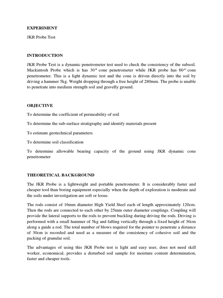 The mackintosh probe is one of most widespread penetrometers in use in saudi arabia. 1:37 why the test is important? The main purpose of the test is to provide an indication of the relative density. The set capable probing up to 13 meters depth depending on around condition. The mackintosh probe development was based on the principles stated by hvorslev (1948) for drive rods for sounding and sampling and recommended methods for static and dynamic sounding by european group subcommittee (1968).