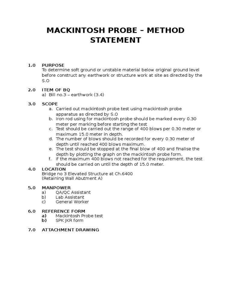 1 submission method statement mackintosh probe test st. Mackintosh probe equipment (plate 1 a) consists of a series of 15 mm diameter steel rods. Mackintosh probe test or soil test is a summary of this video with a runtime of 4 min 46 sec. The mechanism is called the nautical gauge mackintosh probe (ngmp). What is the advantage and disadvantage of using mackintosh probe test. Mackintosh probe test and its bearing capacity related files Use custom templates to tell the right story for your business. 1:37 why the test is important? 1:37 why the test is important? The result obtained from the test provides a rough estimation of the soil layer at a point. Probing is carried out rapidly, with simple equipment. The equipment is particularly used for initial site investigation. View the table of contents for this issue, or go to the journal homepage for more.